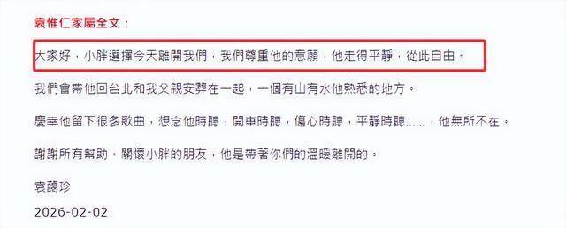 “小胖选择今天离开我们,他走得平静,从此自由。”