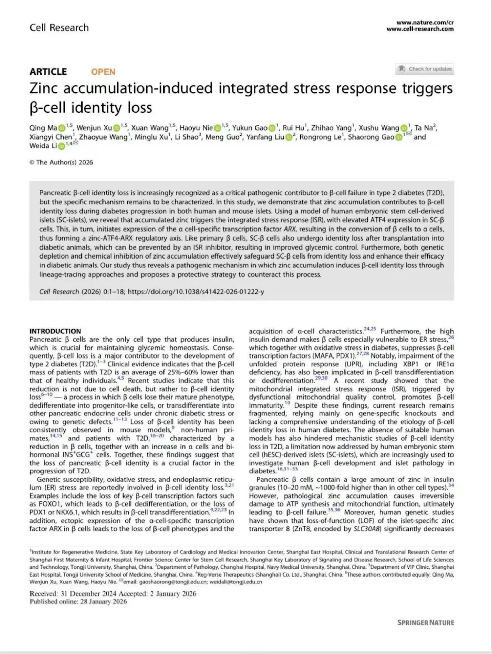 该成果由同济大学李维达教授与高绍荣院士团队合作完成,相关论文1月28日下午在国际权威学术期刊《细胞研究》发表。该研究证明,ZnT8如同调控胰岛β细胞健康的「总开关」。在糖尿病前期及患病过程中,这个开关被异常「打开」,导致细胞内的锌离子失衡,从而加速胰岛β细胞的功能衰退。