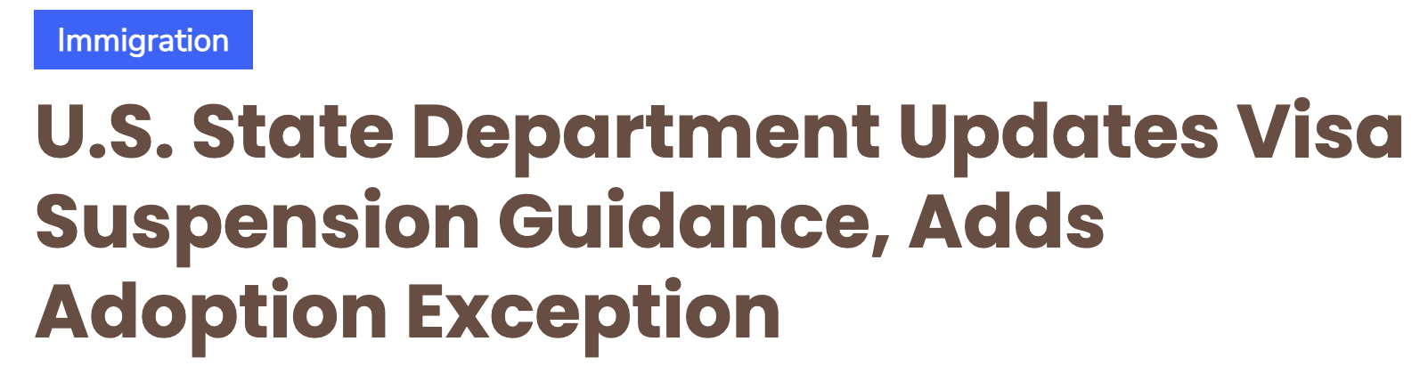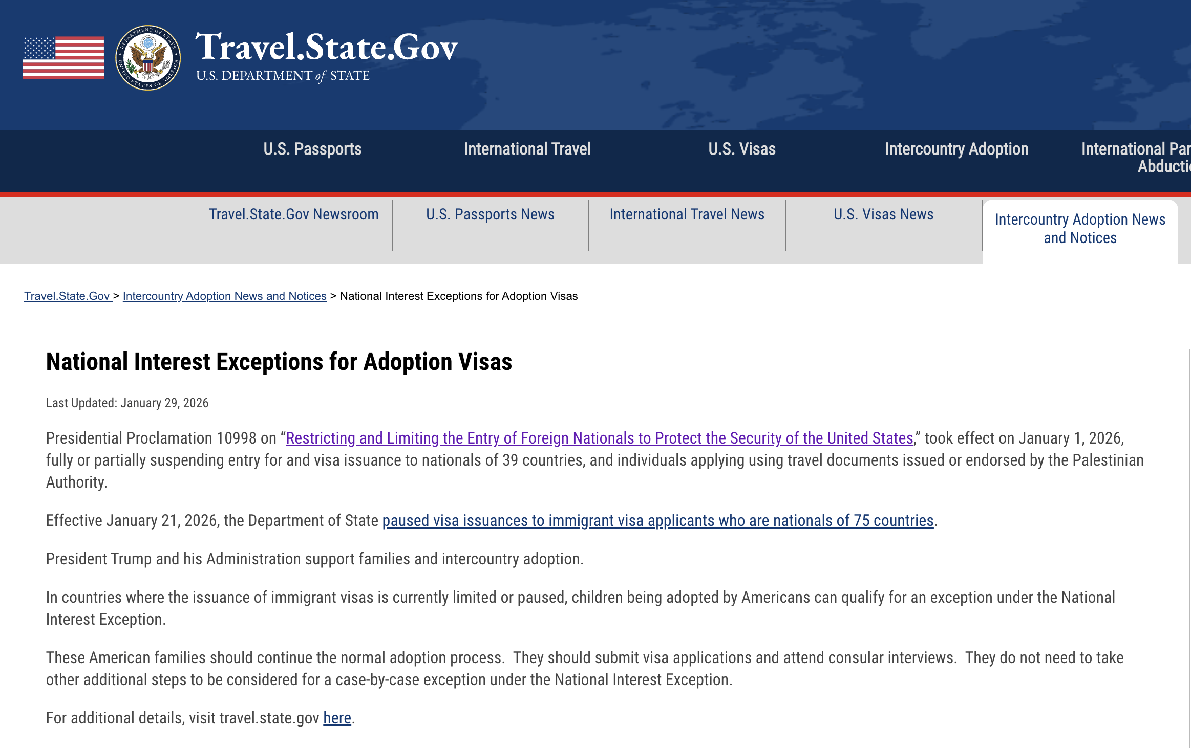 根据2月2日发布的最新说明,国务院明确指出:凡符合美国法律规定、由美国公民合法收养的儿童,其移民签证申请可被纳入国家利益例外考量范围。