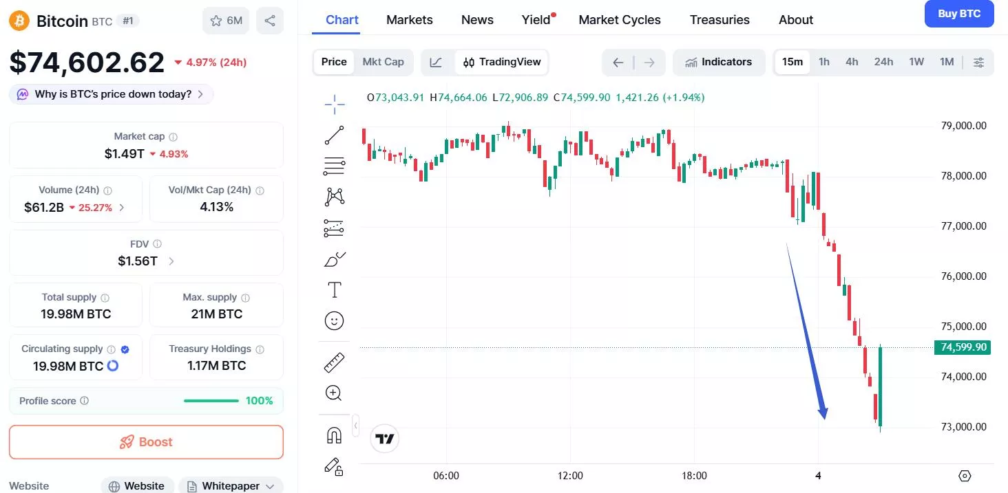 CoinMarketCap数据显示,2月3日周二美股午盘时段,加密货币普遍加速下跌。比特币一度跌破7.3万美元,较亚市早盘7.91万美元上方的日内高位跌超6000美元、跌近8%,刷新2024年11月上旬川普胜选后低位。
