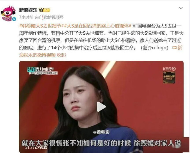 最近 #韩综曝大S去世细节 #和# 大S是在回台湾的路上心脏骤停 #两个话题突然冲上热搜,不是因为有什么新瓜,而是韩国KBS电视台为了纪念大S去世一周年,推出了一档名为《名人生老病死的秘密》的特辑节目,把去年那段让人揪心的往事又重新拉回了大家眼前。