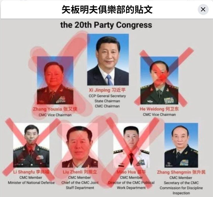 矢板明夫脸书贴出中共二十大后中央军委合成图,多名高层被画上红叉,点出解放军高层接连遭清洗的权力动盪。 图:翻摄自矢板明夫俱乐部脸书