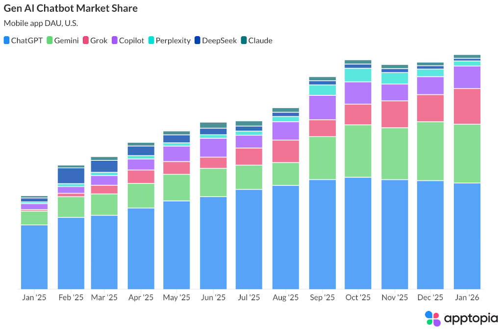 2月4日,据移动应用数据分析和情报服务公司Apptopia向Big Technology提供的数据显示,在2025年1月至2026年1月期间,Gemini的市场份额从14.7%攀升至25.1%,Grok则从1.6%激增至15.2%。这一变化表明,经过一年的激烈竞争,AI聊天机器人市场已从一家独大转向多强争霸。