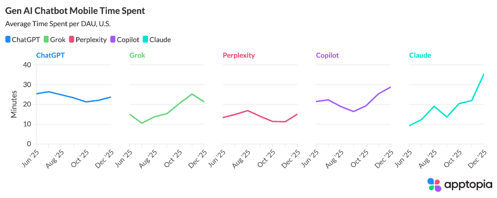 尽管Anthropic的Claude在用户数量上远不及ChatGPT或Gemini,但用户在其上花费的时间大幅增长,从2025年6月的日均约10分钟激增至目前的30分钟以上。