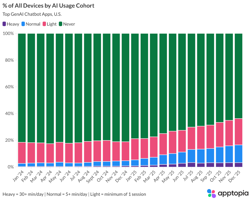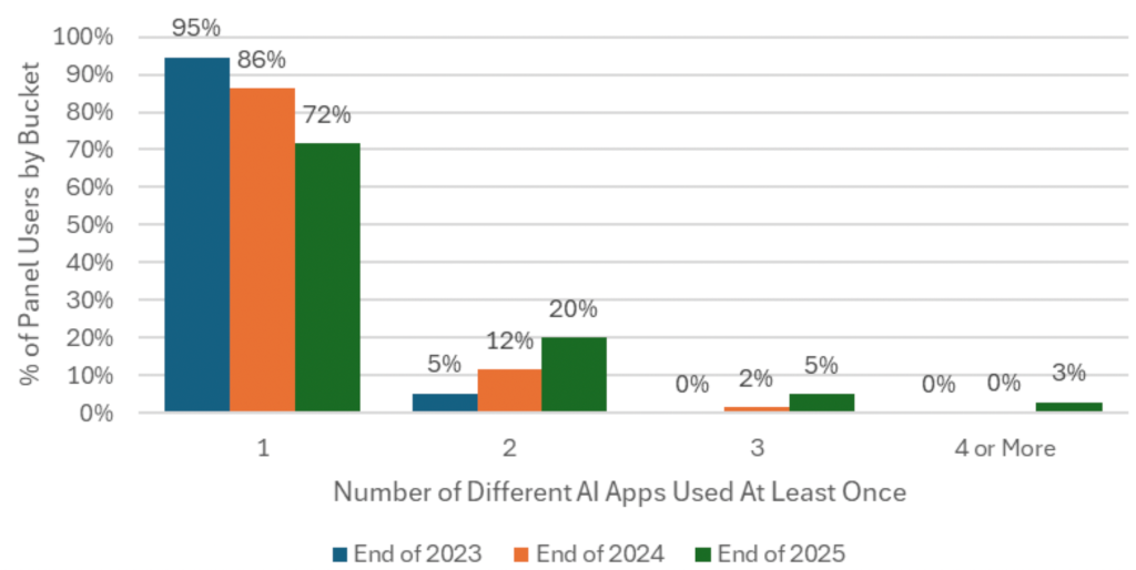 数据显示,到2025年底,20%的聊天机器人用户至少使用两款应用,而2023年底这一比例仅为5%。这表明用户正在根据不同需求选择不同的AI工具,而非局限于单一平台。