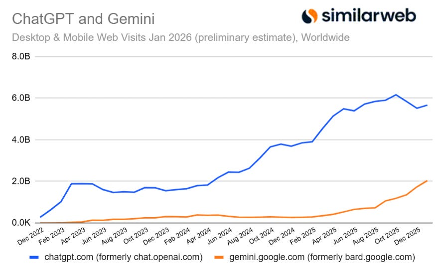 ChatGPT在2025年大部分时间保持强劲增长,但在11月和12月出现流量下滑,恰逢Gemini迎来增长高峰。