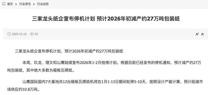 玖龙宣布东莞基地PM1纸机从12月31日起长期停机改造;山鹰国际也宣布各大基地在春节前后轮流停产,最长停机20天;还有行业内媒体说,2026年一季度,头部纸企的总减产规模就将突破80万吨。