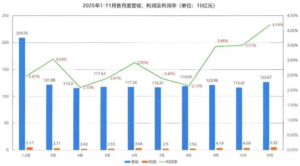 但接着看后面的,在总盘子收缩的情况下,11月单月利润率到了4.19%,比10月涨了三成,创下年内新高。