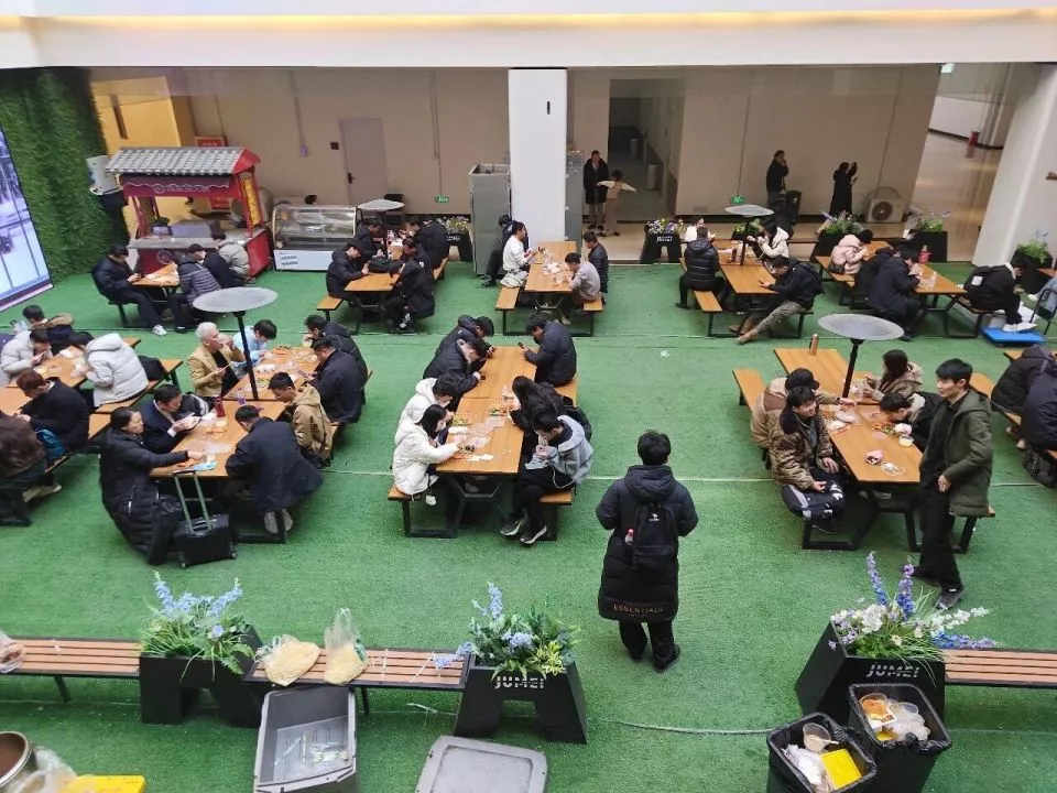 短剧演员们在吃午餐,许多人都穿着西装。易方兴 摄