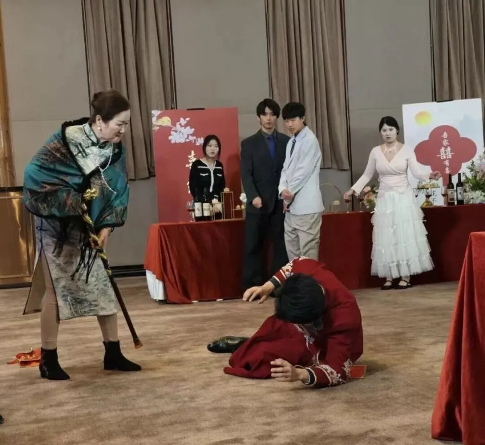 潘艺虹在演拿拐杖打孙子的豪门老太。