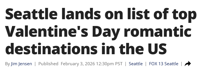 西雅图跻身美国情人节最浪漫目的地榜单Carrie