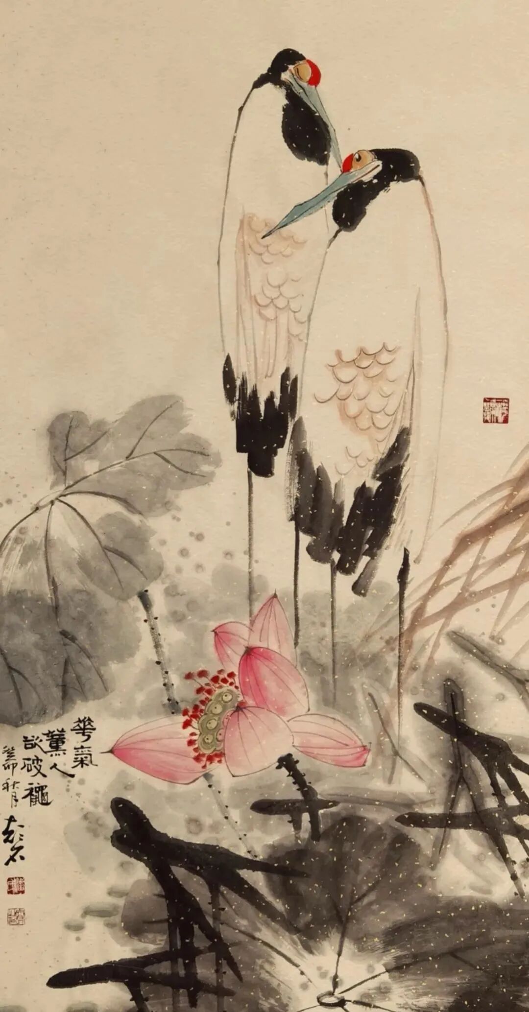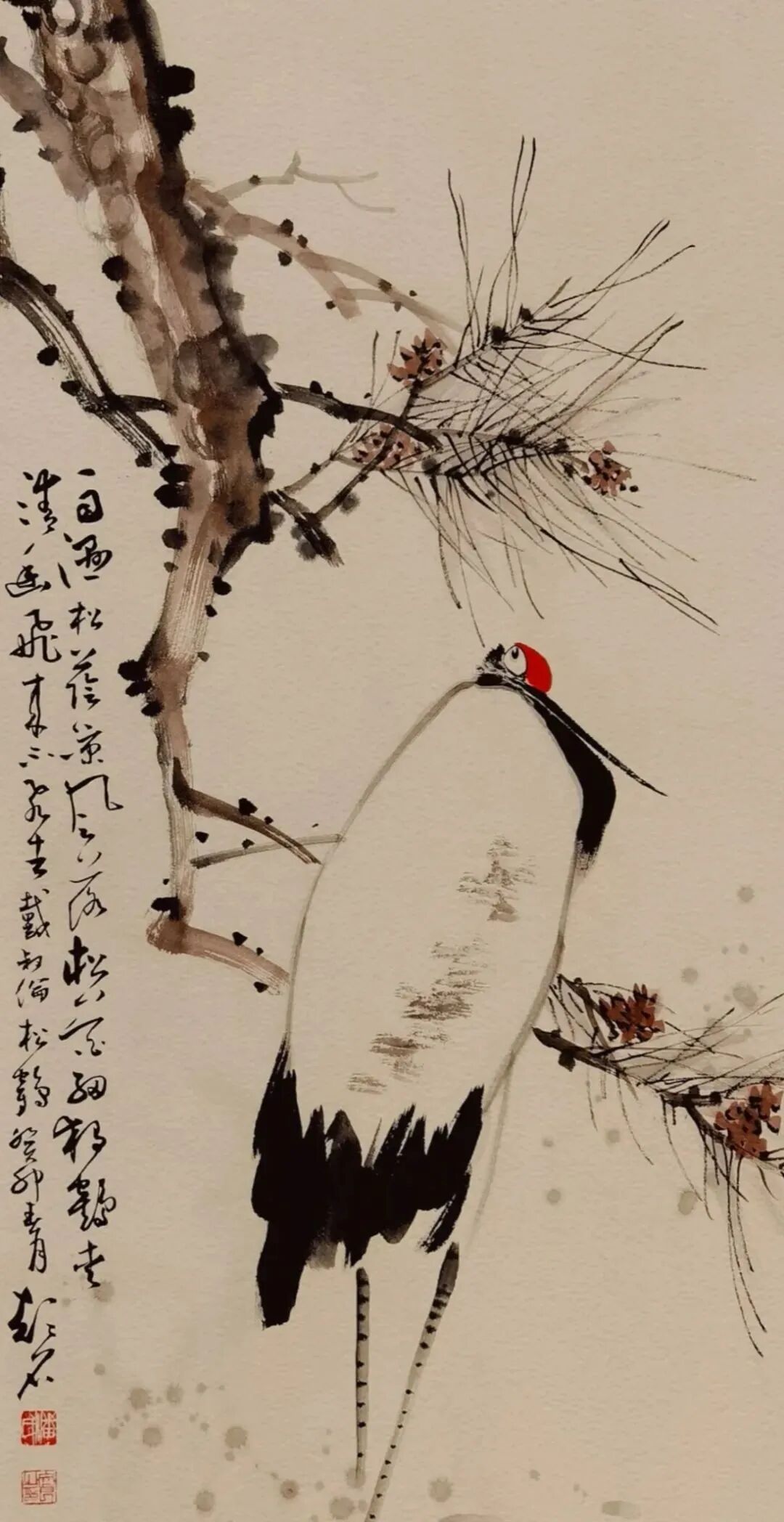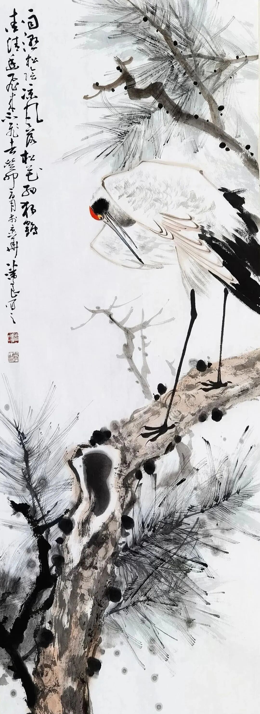 画家潘文良笔下的仙鹤宛如灵动的仙子,以其笔简清幽、意蕴无穷的独特魅力,成为了艺术殿堂中一道亮丽的风景线。