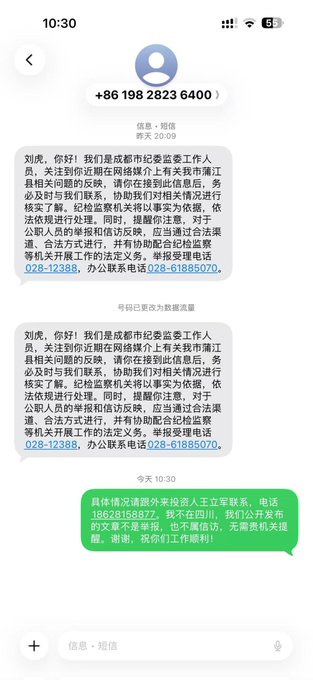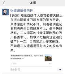 据《BBC》报导,刘虎与巫英蛟于上周日(1日)分别在重庆与河北遭警方带走。两人失踪前,曾在微信公众号发表名为《曾逼死教授的四川县委书记,如今又把招商企业逼向破产》的深度调查报导,揭发四川省蒲江县委书记浦发友的贪腐劣迹。目前相关报导已在中国网络空间遭到全面下架,所有相关连结均已失效。