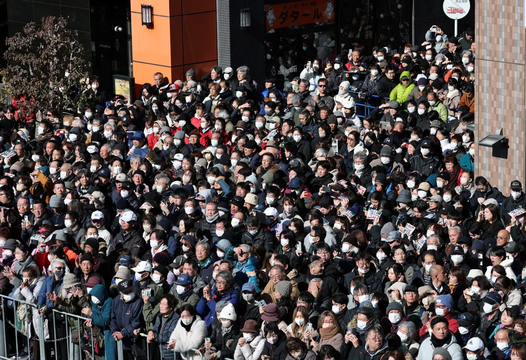 昨天在日本埼玉县东松山市,众多民众等待高市早苗首相到来,为自民党候选人站台拉票。(路透)