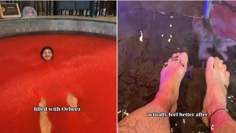 此外,旅馆还有充满红色水晶宝宝(Orbeez)的温泉池,乔丹惊呼“我梦想可以实现了。”除上述,业者亦有提供鱼疗池,泡下去后“感觉脚上每一寸都被鱼包围着”牠们会来吃脚皮,乔丹表示,泡完后脚变得很舒服。