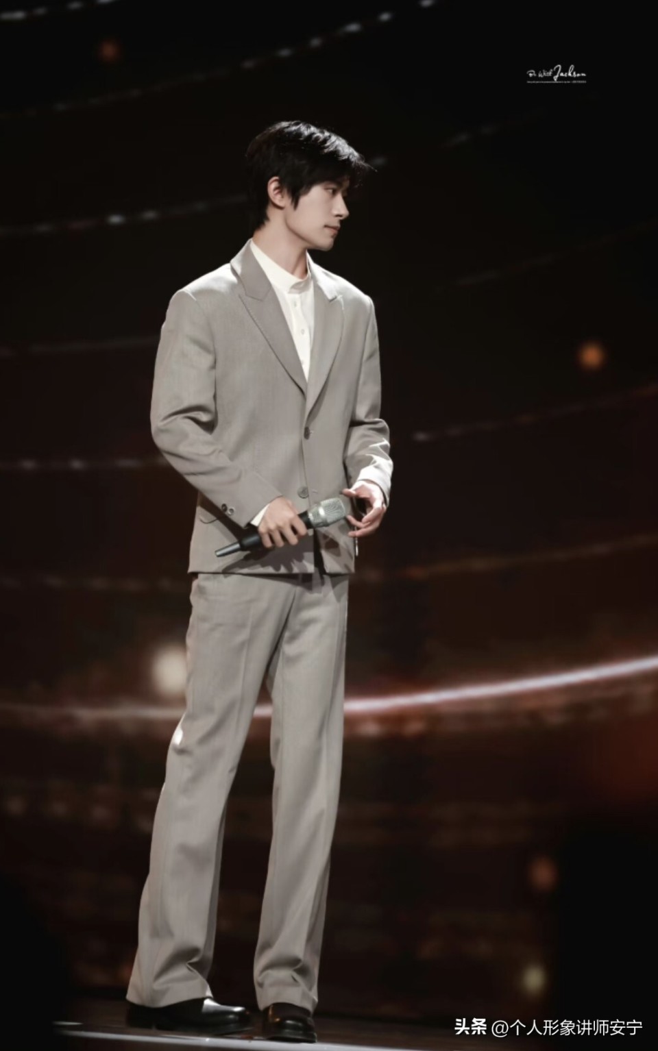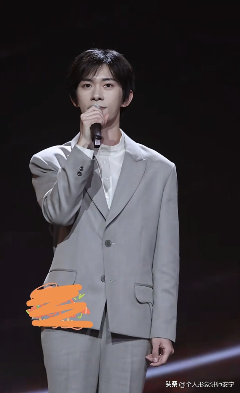 易烊千玺还是很少穿的这么中庸,一套灰色的套装,显得体制内感十足,像是年轻的小干部在做年终报告。