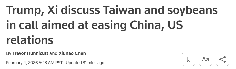 美国总统川普2月4日周三与中国国家主席习近平进行电话,双方就台湾问题、大豆采购以及一系列贸易与安全议题交换意见。川普形容此次通话“非常积极”,并表示中国正考虑大幅增加从美国采购农产品,此举被视为中美关系缓和的重要信号。