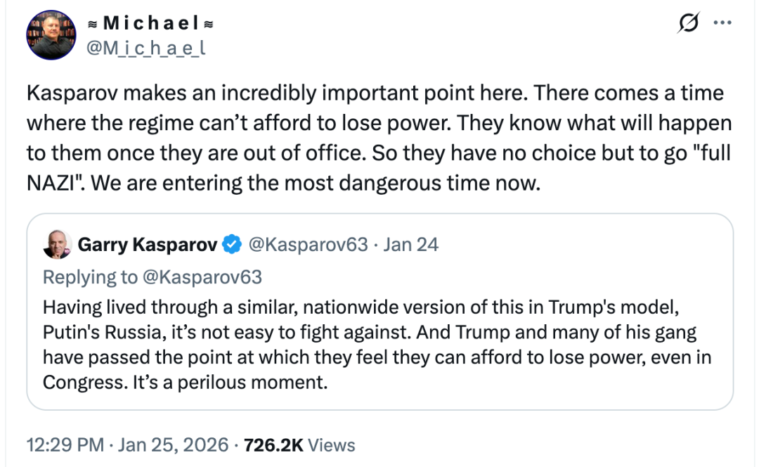该推文说,当政权意识到自己已无力承受权力丧失的代价时,他们深知下台后的命运。于是别无选择,只能彻底“纳粹化”。我们正步入最危险的时期。