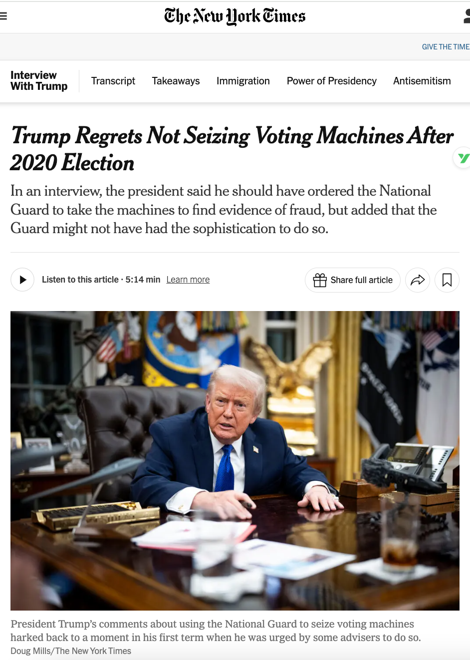今年1月他在接受《纽约时报》访谈时坦言,后悔未在2020年大选后派遣国民警卫队扣押投票设备(见上图报道)。