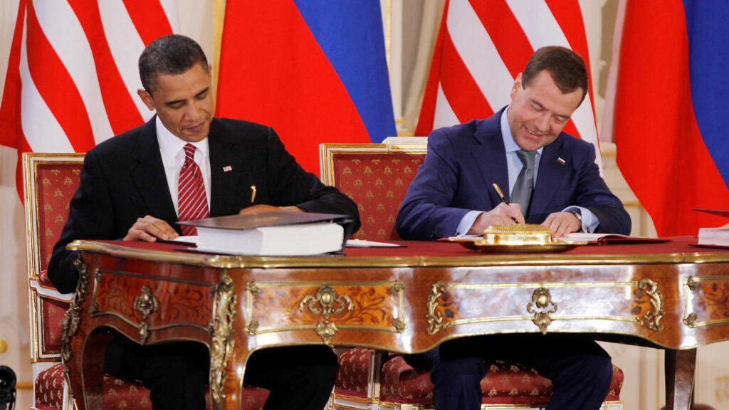 2010年4月8日,美国总统奥巴马与俄罗斯联邦总统梅德韦杰夫在捷克首都布拉格签署《新消减战略武器条约》。该条约于2026年2月5日到期。 REUTERS - Jason Reed