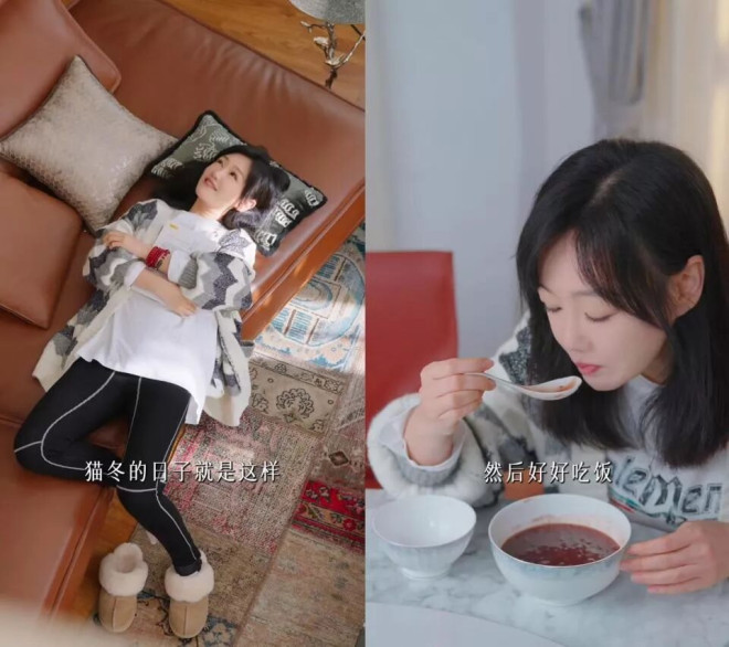 不拍戏的时候,她就窝在阳光里躲懒,到了饭点就给自己做养生餐……