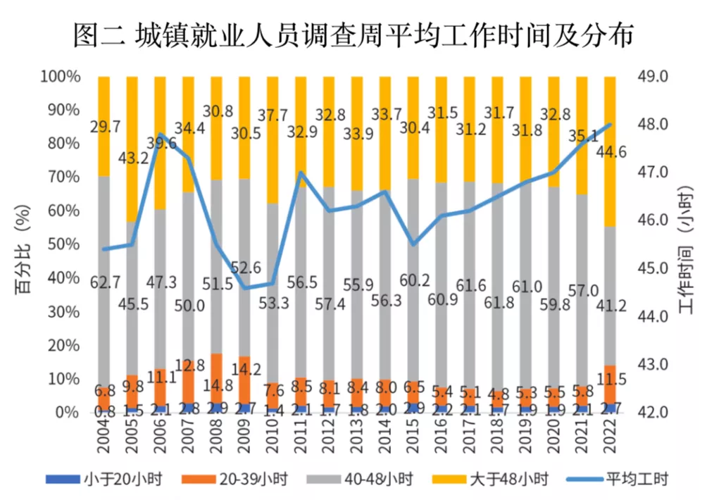 从整体来看,中国就业人员工作时长仍旧处于高位,超过相关法规规定的“每日工作时间不超过8小时”“平均每周工作时间不超过44小时”的工时标准。