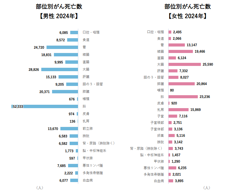 男性致死前五: 肺癌、大肠癌、胃癌、胰腺癌、肝癌。