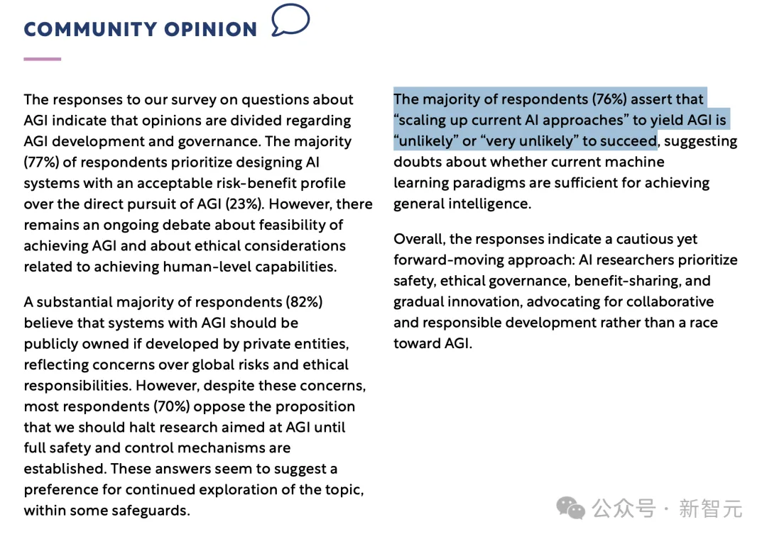 然而,在2025年3月的一项调查中,76%的顶尖 AI 研究人员表示,当前的方法「不太可能」或「极不可能」实现通用人工智能(AGI)。