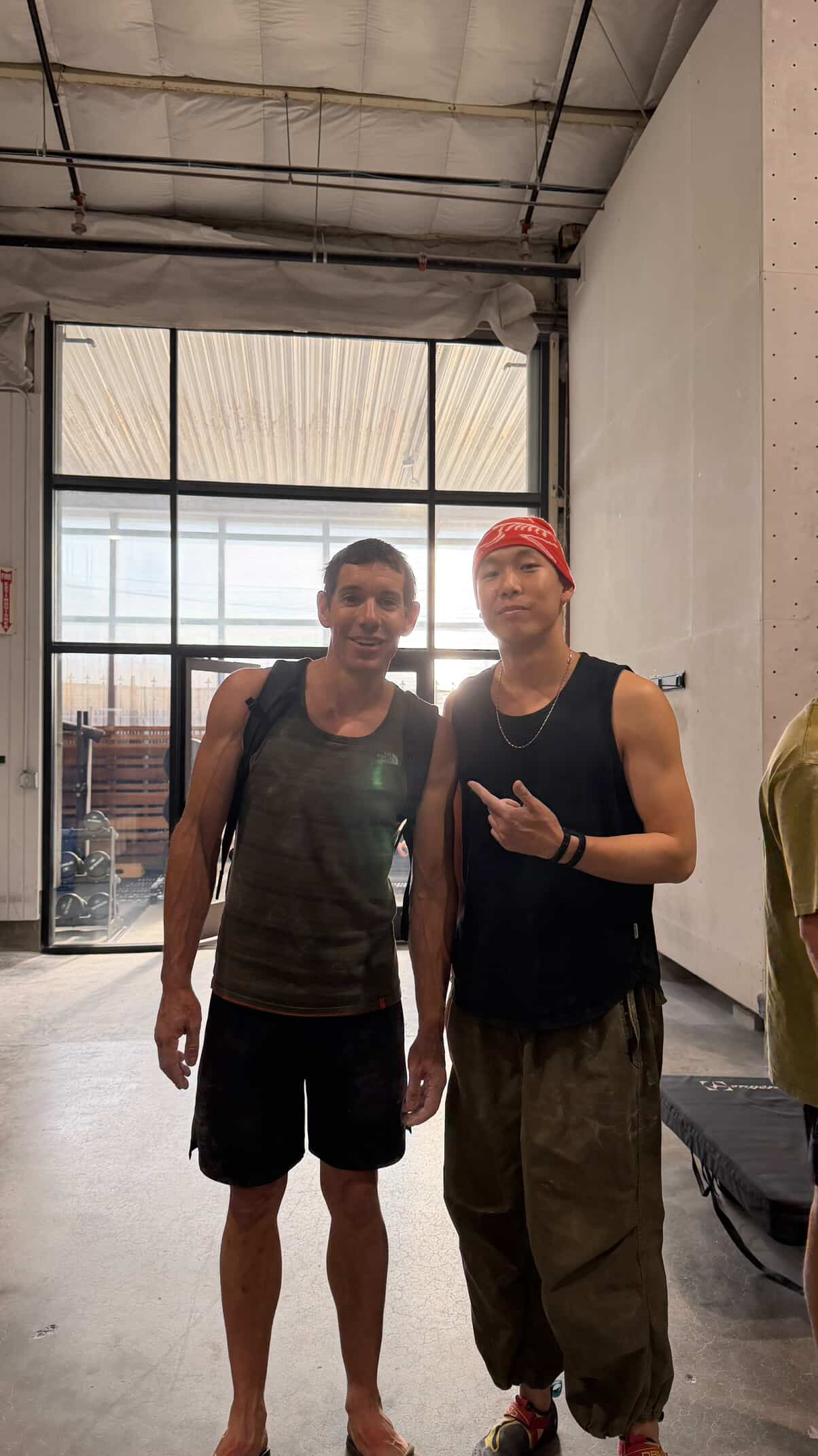 住在洛杉矶市中心的陈先生在好莱坞一处攀岩馆,撞见刚挑战完徒手攀登台北101大楼的美国自由攀岩运动员霍诺德(左),并表示,第一次近距离见到这位攀岩界「大神」,真的紧张到说不出话。(陈先生提供)