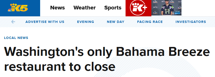 据报道,位于塔克维拉的巴哈马微风餐厅(Bahama Breeze)宣布将于4月永久关闭,这是该品牌在华盛顿州的唯一门店。