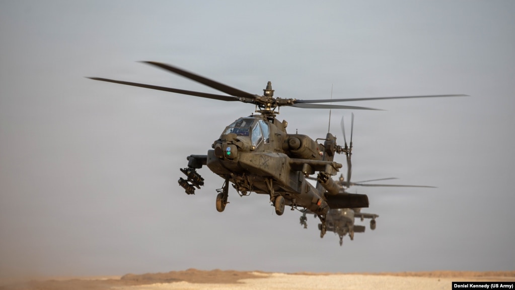 资料照片:2025年11月4日,隶属于美国陆军第4战斗航空旅第17空骑团第6中队“夜鹰”特遣队的两架AH-64阿帕奇直升机在美国中央司令部责任区内执行航空作战任务时飞越着陆区。