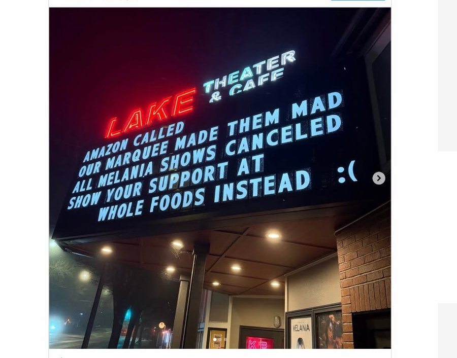 湖畔戏院的招牌玩笑式广告,让砸钱买下《梅兰妮亚》纪录片授权的电商巨头亚马逊(Amazon)完全笑不出来。戏院在IG的官方帐号周日(2日)发文公告:“我们接到电话,高层(也就是亚马逊)对于我们在正门看板宣传他们家电影(也就是《梅兰妮亚》)的方式很不满意,高层说了,星期日是本戏院放映本片的最后一天。”贴文还表示,戏院接获大量电邮、语音留言、谷歌或Yelp评论,有些人不满戏院为何上映《梅兰妮亚》,有些人批评戏院的广告词。