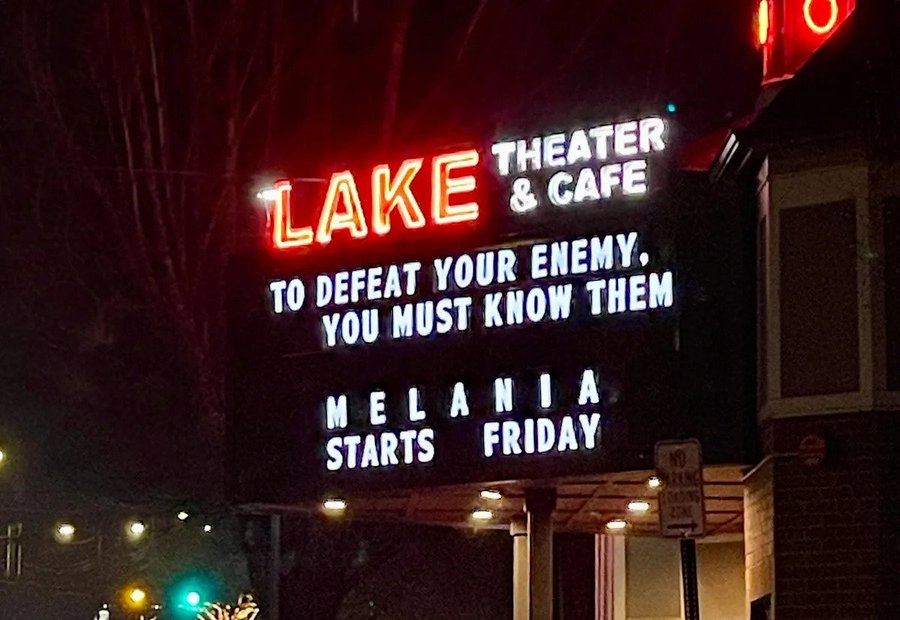 戏院这回为总统夫人的纪录片宣传也绞尽脑汁,片子上映前,戏院正门看板发布了广告词,诸如“梅兰妮亚穿Prada吗?星期五见分晓”、“知己知彼,百战不殆。《梅兰妮亚》星期五上映”。