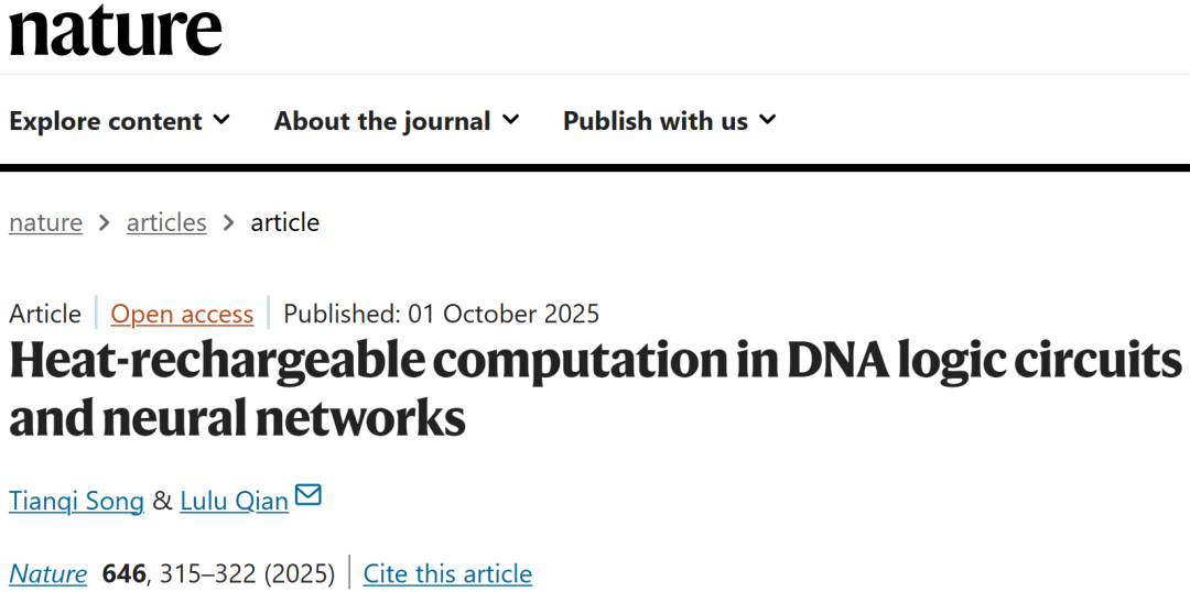 相关论文以“Heat-rechargeable computation in DNA logic circuits and neural networks”为题,发表在Nature上,该论文作者仅2人,钱璐璐教授担任唯一通讯作者,Song Tianqi为论文唯一第一作者。