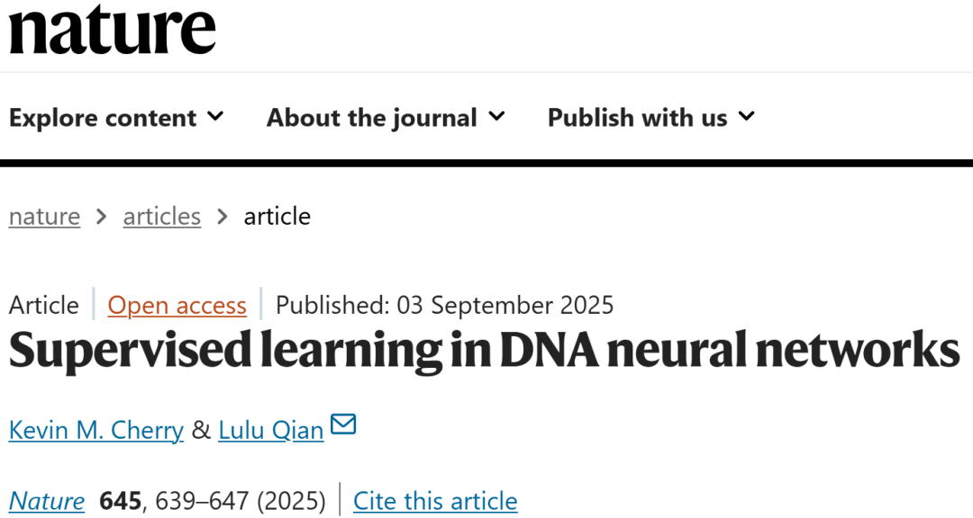 另外,2025年9月3日,加州理工学院钱璐璐团队在Nature 在线发表题为“Supervised learning in DNA neural networks”的研究论文,该研究展示了DNA分子可以被编程为自主地在体外进行监督学习,系统学习从输入和期望响应的分子示例中执行模式分类。