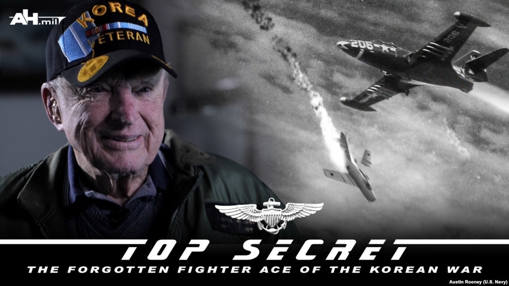 资料图片:展现退役海军上校罗伊斯·威廉姆斯在朝鲜战争期间单机击落数架米格战机壮举的视频招贴画。(2018年12月1日)