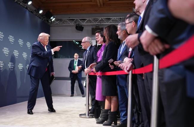 2026年1月,川普总统在瑞士达沃斯世界经济论坛与商业领袖们的招待会上。 Doug Mills/The New York Times