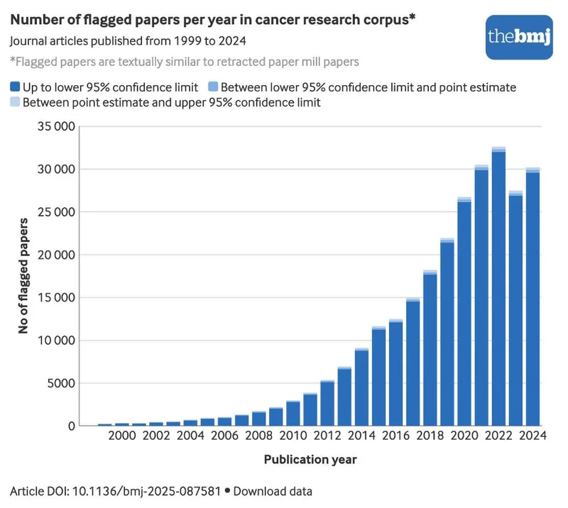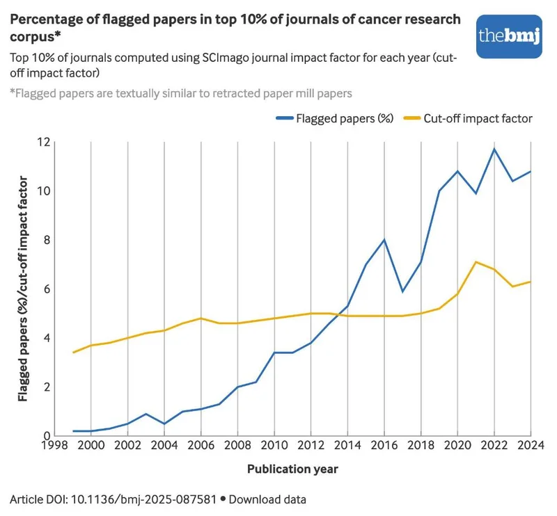 1月30日,医学领域顶级期刊《英国医学杂志》(The BMJ)发表了一项令人震惊的研究:在1999年至2024年间发表的癌症研究论文中,每10篇就有1篇疑似论文工厂产物;其中中国的情况尤为严重,每3篇就有1篇疑似问题论文。