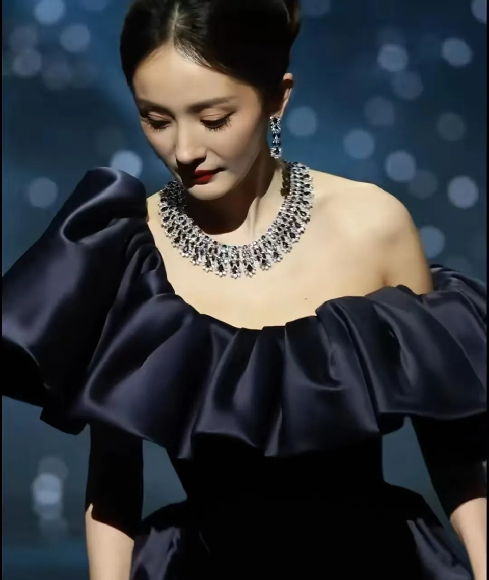 再看杨幂整体妆造,蓝黑色礼服看似低调,实则暗藏玄机,耳戴大珠宝、脖挂大项链,睫毛一层又一层配上粗黑眼线,眼影同样很浓重,妆似淡实浓,永远不知道一个女明星举重若轻的出场背后藏了多少努力啊!