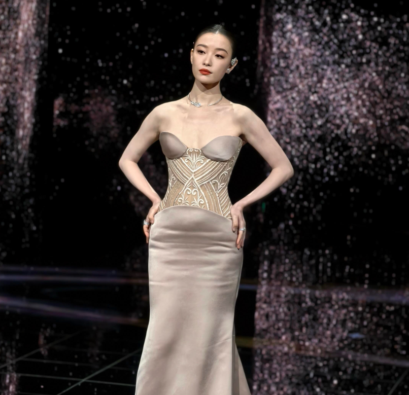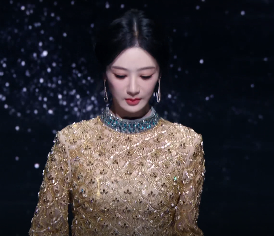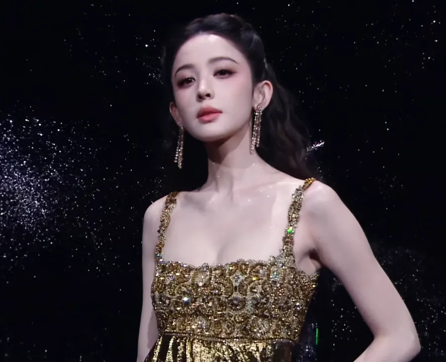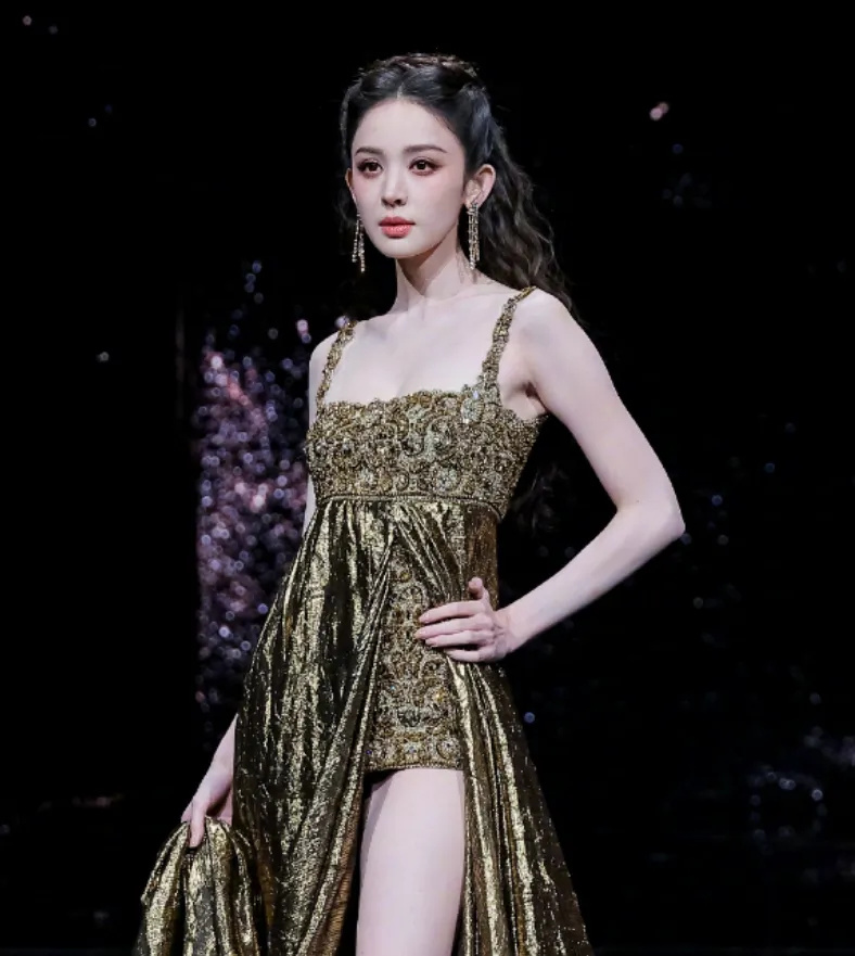 娜扎穿着金色高开叉长裙,肌肤雪白、锁骨都是高光,一整个金光闪闪。