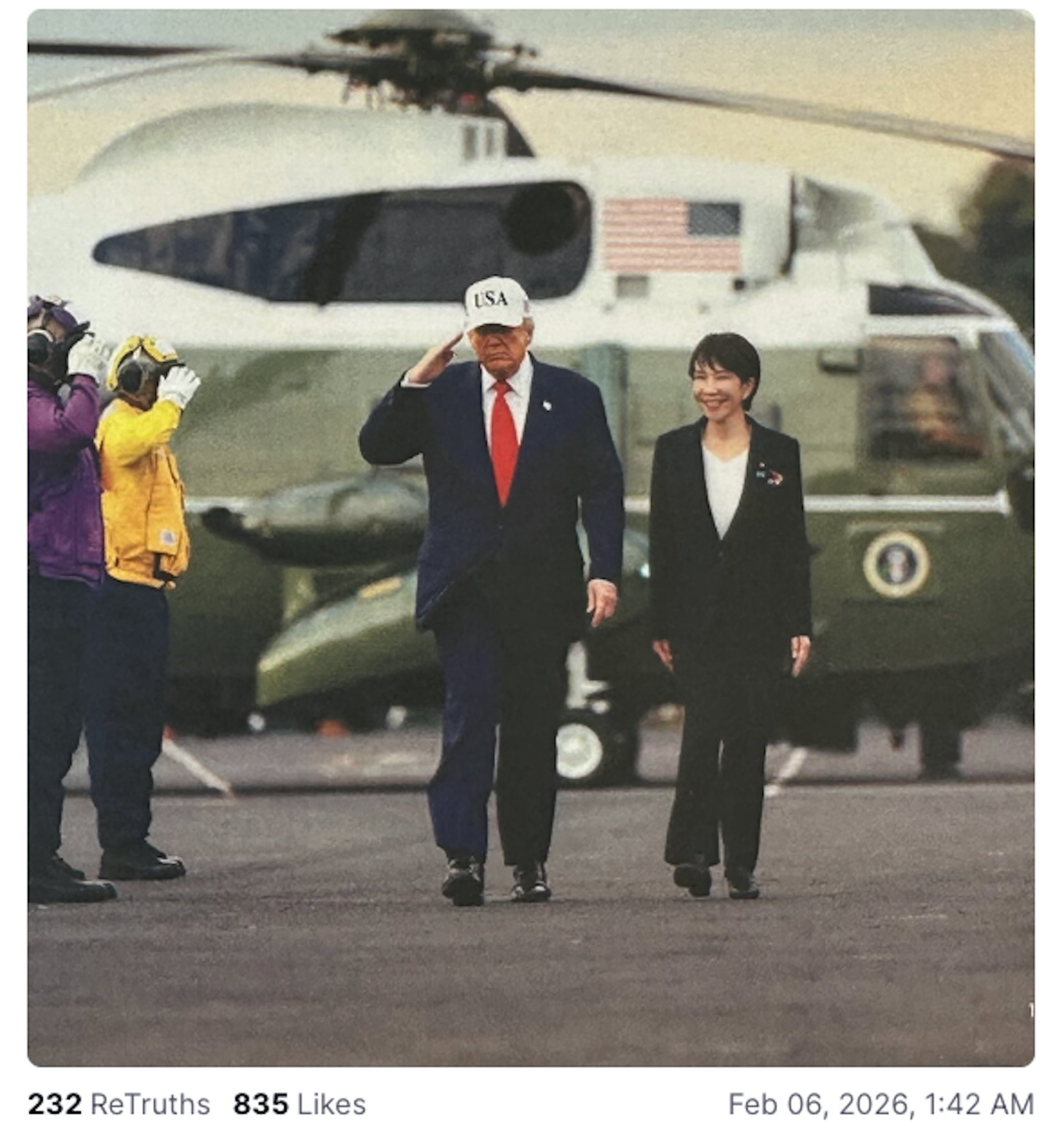 当谈到高市早苗的工作能力时,特朗普称:「高市首相及其执政联盟的工作值得高度赞扬,因此,作为美国总统,我很荣幸地能够给予她以及她备受尊敬的执政联盟绝对支持。她不会让日本人民失望!祝您在周日重要的选举顺利!」