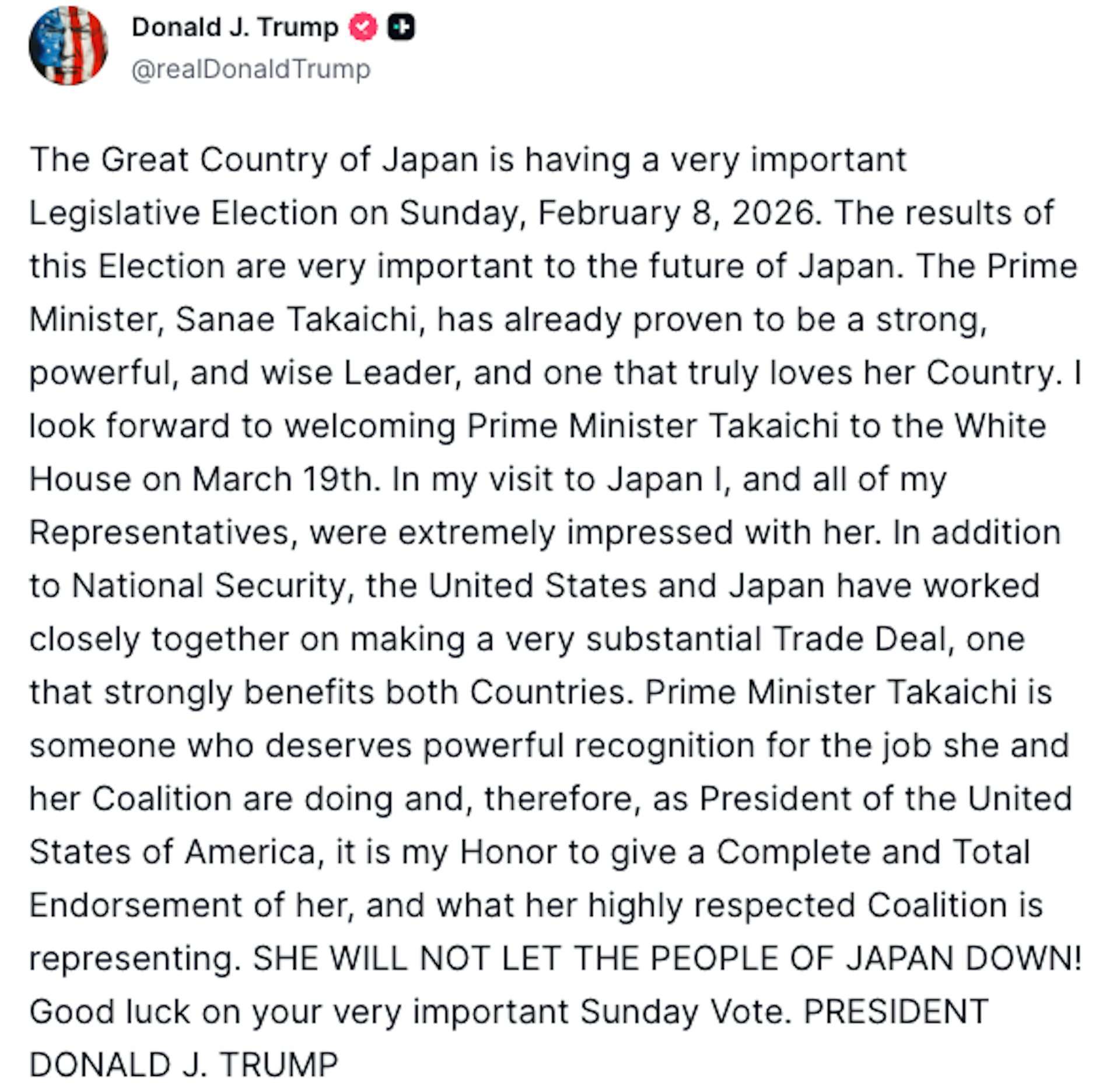特朗普5日在其社交平台Truth Social发文表示:「伟大的日本将于2026年2月8日星期日举行非常重要的立法选举。这次选举结果对日本的未来至关重要。首相高市早苗已证明自己是一位坚强、有力、睿智的领导人,一位真正热爱祖国的领导人。」