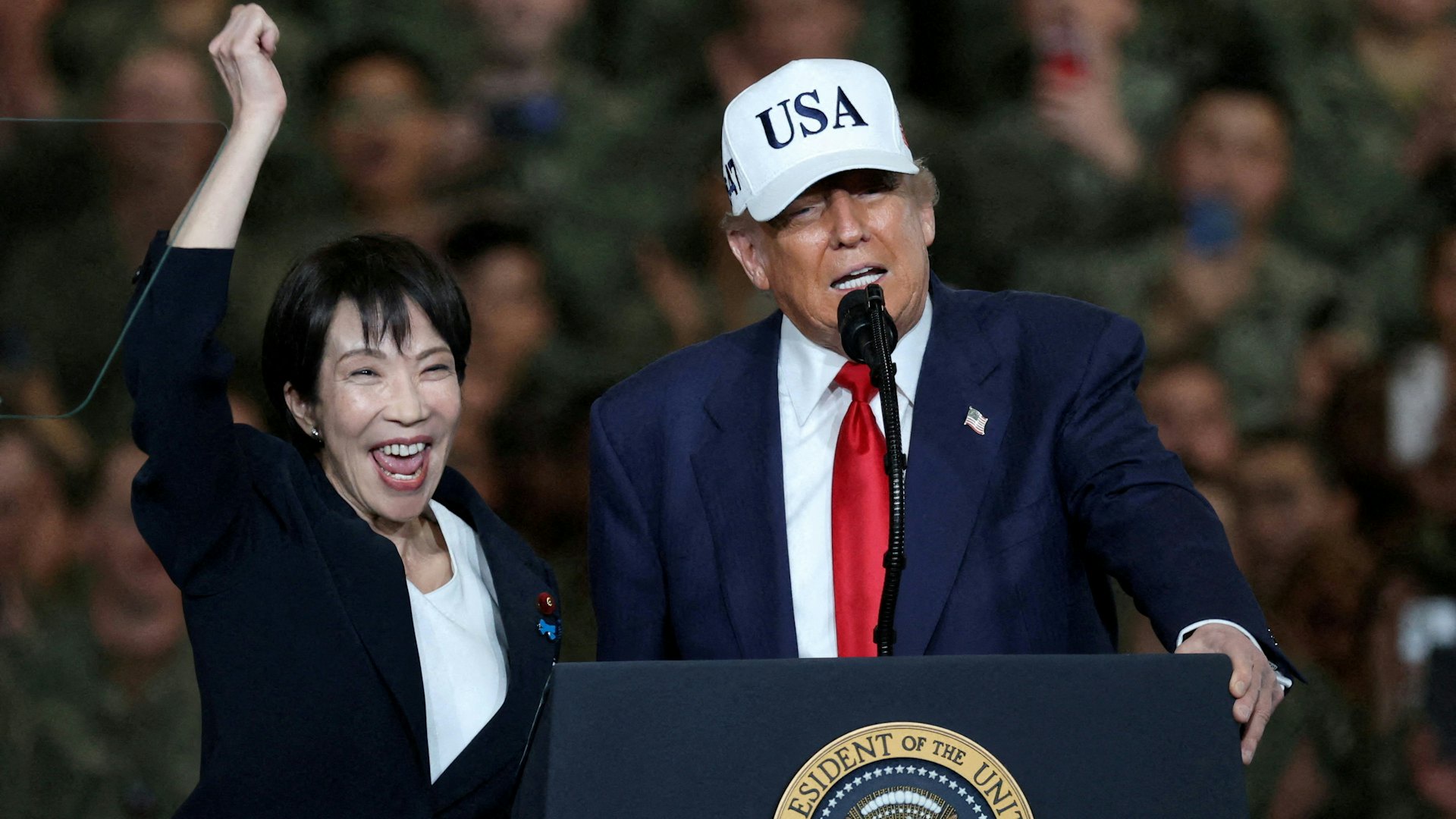 2025年10月28日,日本(专题)横须贺基地,美国总统特朗普(专题)(Donald Trump,右)与日本首相高市早苗(左)在「乔治华盛顿号」航空母舰(USS George Washington)上向军人发表演说。(Reuters)