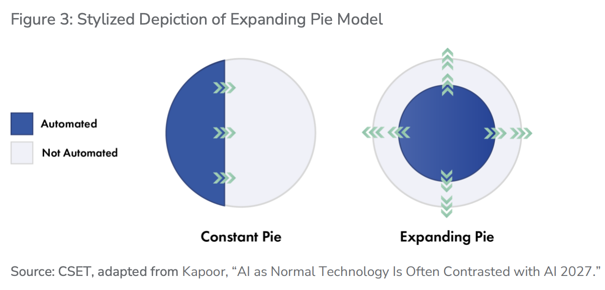 4、扩展饼图模型则认为,随着AI自动化某些AI研发活动,人类研究人员会反复发现,持续进展需要AI系统尚无法自动化的新型贡献。AI研发可能进展非常迅速,但人类仍是研发过程的核心。