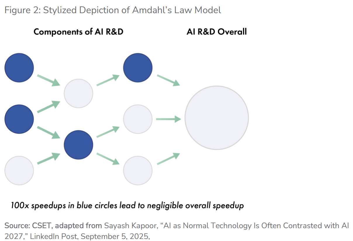 3、阿姆达尔定律模型认为,AI仅能自动化某些特定领域的AI研发活动(如编写代码和运行实验自动化了,但提出全新研究项目或运营数据中心未能自动化)。即使自动化加速了研发流程的某些部分,整体进展仍受AI无法自动化的研发活动瓶颈限制,因此无法实现完全自动化。