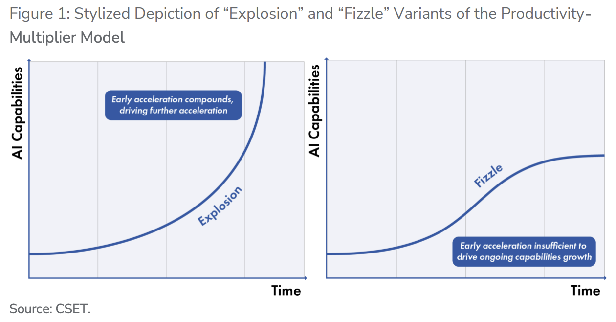 对这些动态中哪一种将占主导的不同预期,与对AI进展"曲线形状"的截然不同答案相关:AI研发进展速度有多快?进展会因复合改进而加速还是因收益递减而减速?AI能力达到顶尖人类AI研究员水平的可能性有多大?如果AI能力确实达到专家人类水平,在该点之后不同任务的性能上限在哪里?是否存在会阻碍AI研发进展的瓶颈?