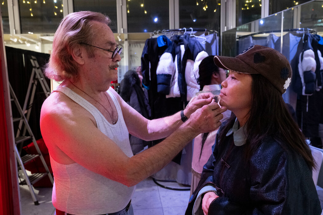 卡伦为剧中另一位演员梁清宏戴上假胡子。