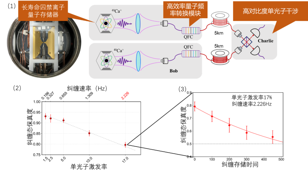 图3.可扩展量子中继的基本模块原理图。(1)实验由长寿命囚禁离子量子储存器、高效率量子频率转换模块与高对比度单光子干涉模块组成。(2)纠缠建立速率为2.226赫兹,即等待时间约450毫秒。(3)纠缠寿命约550毫秒。