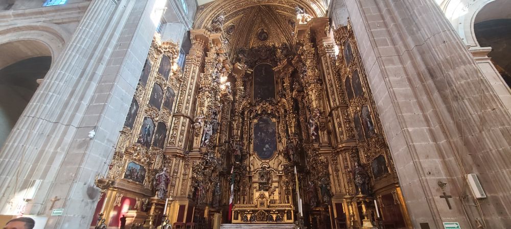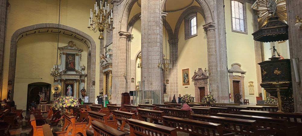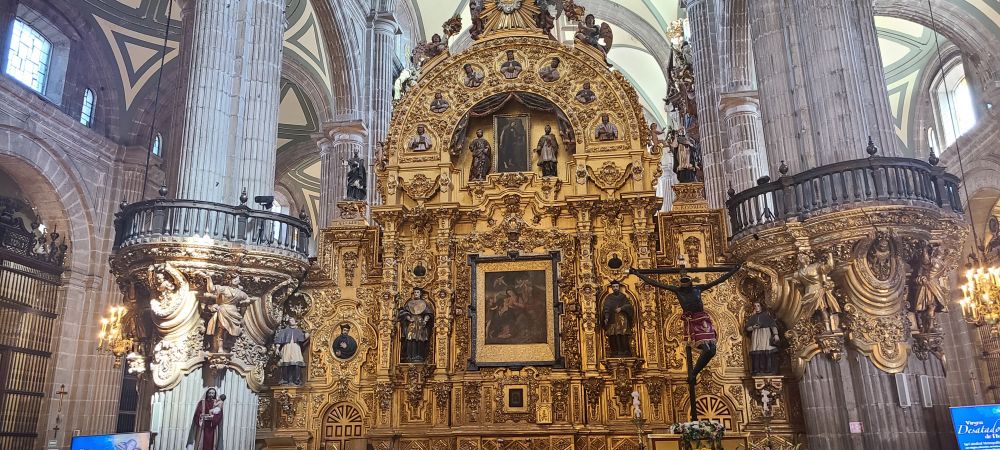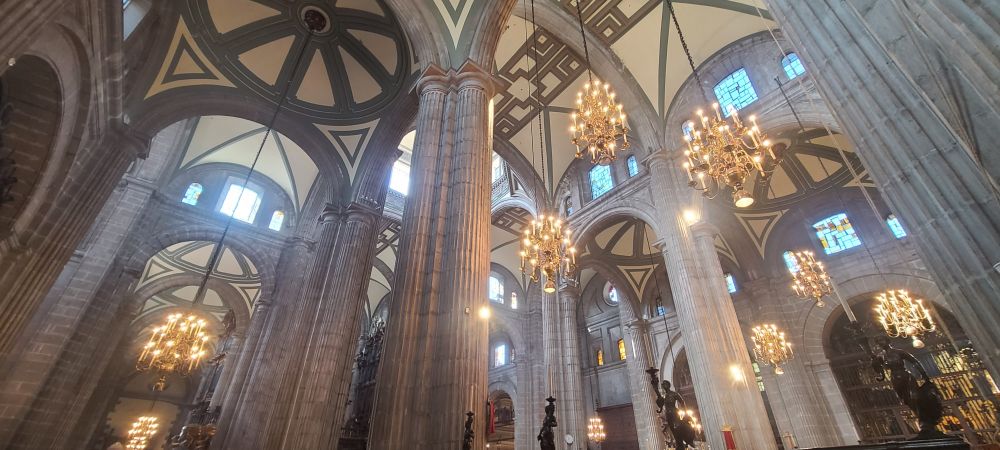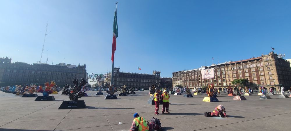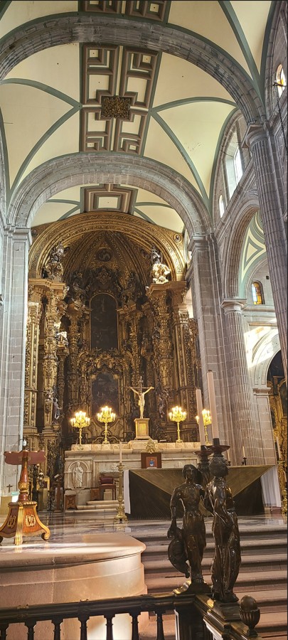 导游带着我们走马观花看了一圈主要景点所在地。从我们旅馆出发,先到宪法广场,广场一圈不是政治中心,就是宗教中心。目前广场中间围起来有一个墨西哥各地艺术家的仙人掌作品展览,五颜六色,各式形状,挺有意思。要早上11点才会开放给大家进去看仙人掌作品,我们经过时还没开放。导游带大家先去大神庙博物馆遗址,给大家讲解一下此地的历史。墨西哥城原来也是在以前的本地土著神庙遗址上建起来的。然后进去墨西哥城大教堂,里面还在弥撒,所以不少地方拦起来不给进。国家宫每天有免费英语的tour,但是需要10点前排队拿票,我们只好明天再拿。然后溜达过Gran Hotel Ciudad de México, 它的大厅顶部是美丽的Tiffany彩绘玻璃,美轮美奂。导游给我们看了一张1930年的老照片,可以前后对比一下。这里的电梯是仿照巴黎的Bon Marche造的,而且还是墨西哥城的第一部电梯。接下来到house of tiles ( 瓷砖房子,也就是我们昨晚晚餐的地方), 国家美术馆,9.16大道,讲述墨西哥独立史,经过邮政宫,最后停留在可以看见艺术宫的地方,结束行程。我们觉得3小时tour还不错,按美国惯例要给小费,我们这些美国加拿大游客都早早准备了一点墨西哥比索,给了女导游。我们中有一对欧洲来的年轻人,没有经验,我看到他们非常抱歉的和导游解释没带现金,女导游非常友好的告诉他们“Don't worry, it's ok"。