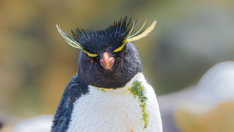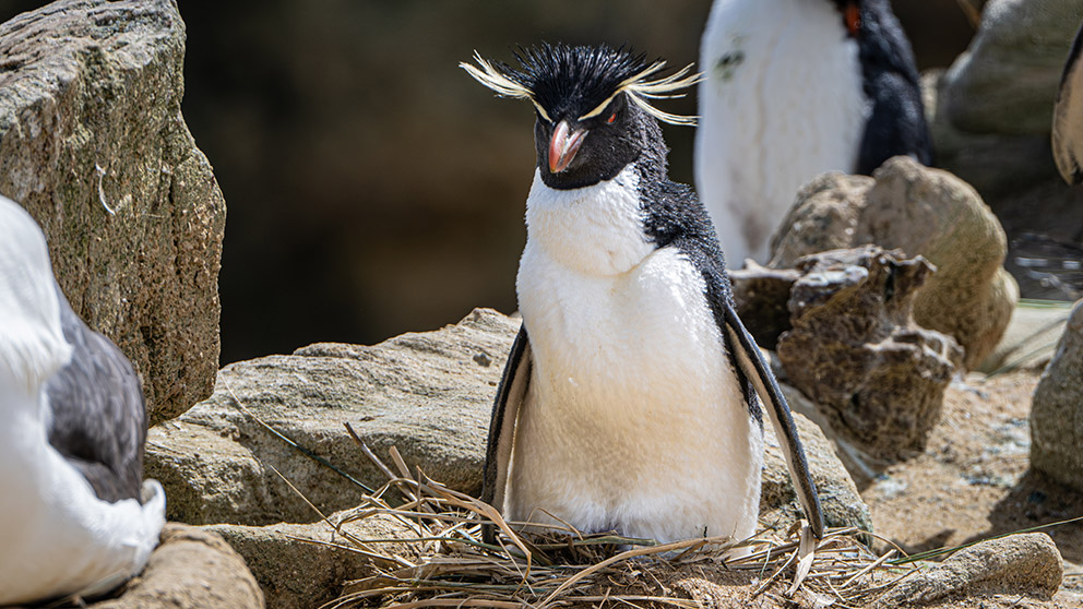 10) 跳岩企鹅(Rockhopper Penguin)是南极企鹅界的小混混。它们好战好斗,可以跳跃攀爬陡峭的礁岩。虽不能飞也要和蓝眼鸬鹚及信天翁等海鸟们一起把家安在崖壁上